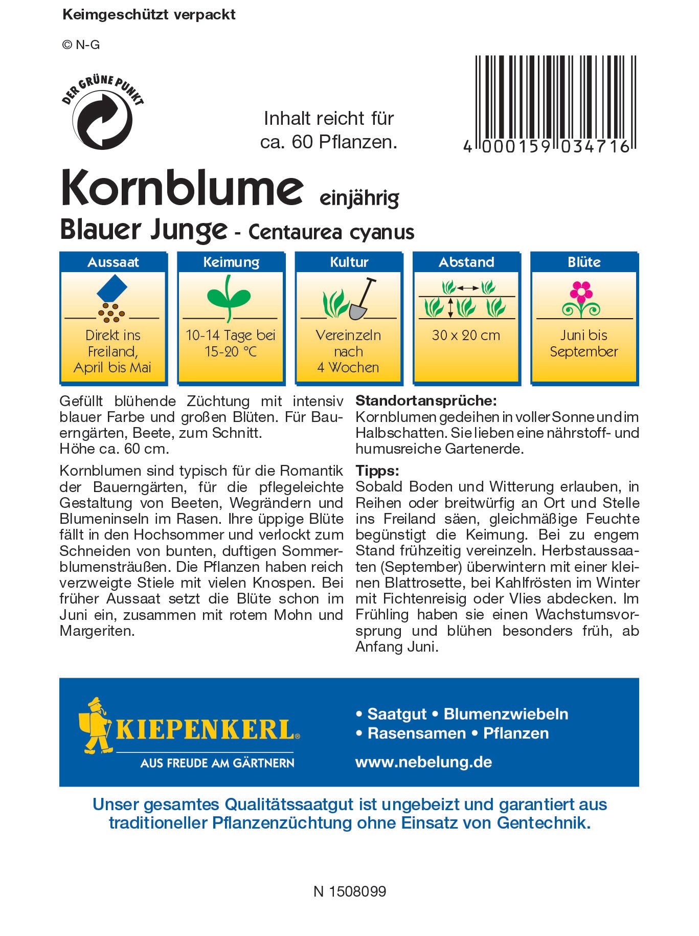 Sadržaj paketa:1 kom Veliki, puni cvjetovi upadljivo plave boje. Poznata biljka seoskih vrtova.