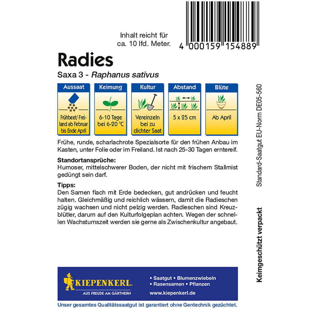 Sadržaj paketa:1 kom Rana, okrugla, crvena rotkvica za uzgoj u posudi, ispod folije ili na otvorenom. 25-30 dana nakon sijanja već se može brati. 1 pakiranje dovoljno je za cca. 10 dužnih metara.